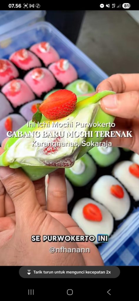 Terakhir ada Ichi Mochi yang berlokasi di Alun-Alun Purwokerto. Mochi lembut dengan isian melimpah ini menjadi cemilan favorit saat menikmati suasana kota di sore dan malam hari. Teksturnya chewy dan halus, dengan pilihan rasa seperti matcha, coklat, tiramisu, stroberi, dan choco crispy yang semuanya punya penggemar masing-masing. Packaging yang rapi dan estetik membuat mochi ini sering dijadikan properti foto dan konten review. Banyak anak muda mampir untuk membeli mochi ini sebelum duduk santai, menikmati live music, atau mengobrol santai di sekitar alun-alun.